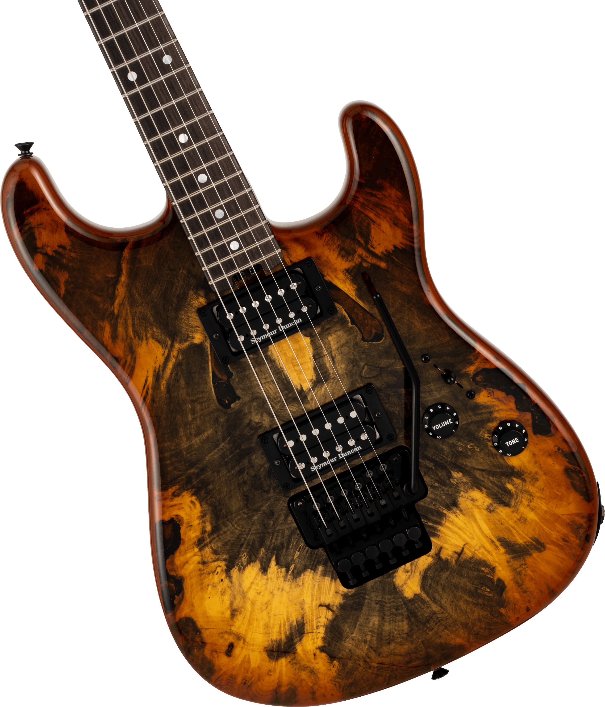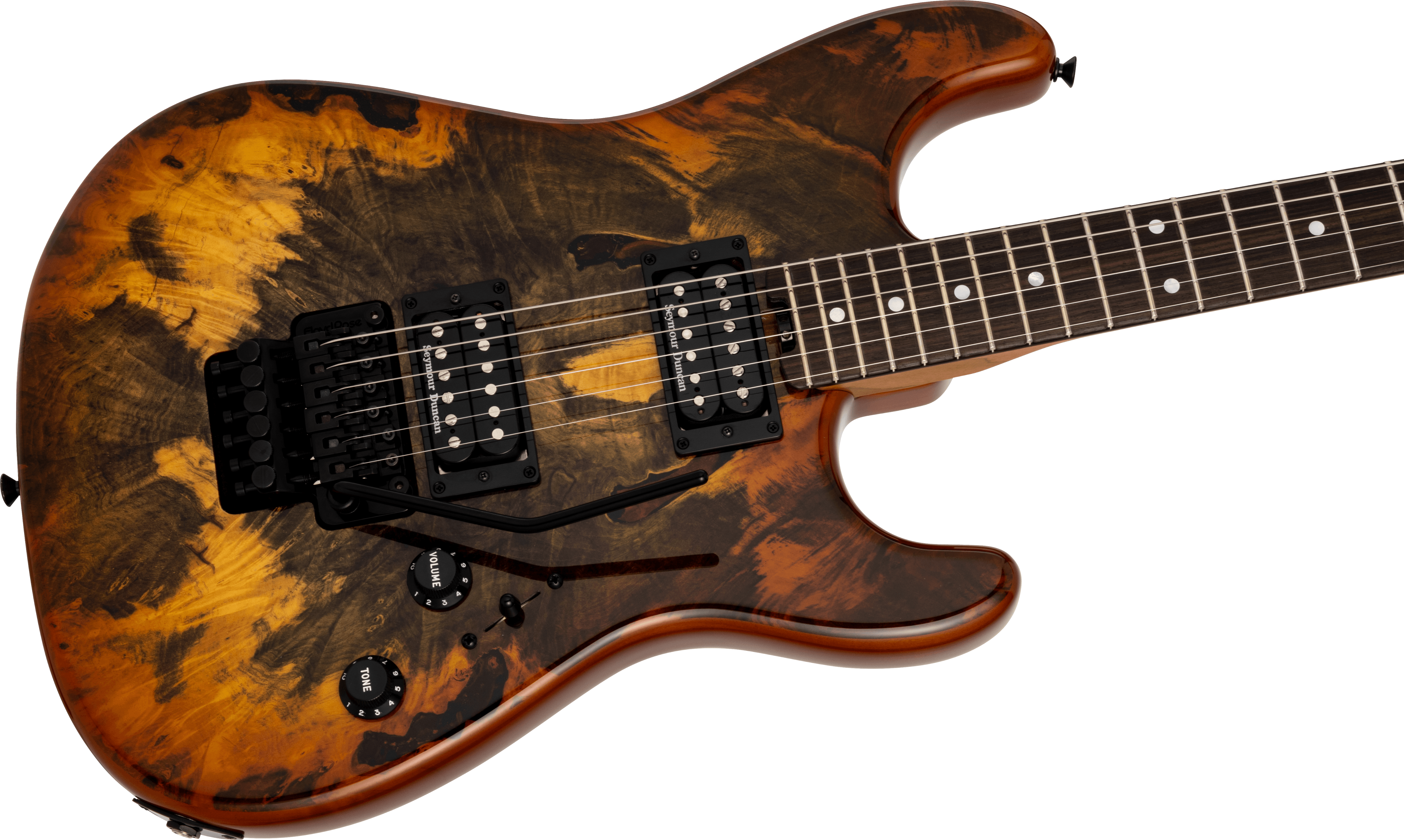 マスタービルダー、デヴィッド・ブラウンによるスペックピース。希少なバックアイバールトップが暖かみを感じさせる優雅な雰囲気を醸し出しています。ネック材には木材の強度に配慮してローステッドメイプルを使用し、ビルダー厳選のローズウッド指板を採用しています。ブリッジには、ダイナミックなアーミング奏法と優れたチューニング安定性を実現するフロイドローズを搭載。ピックアップには、ネックポジションにバッキング仕様のギター王道であるセイモア・ダンカン製'59を、ブリッジポジションには同じくセイモア・ダンカン製JBを搭載し、幅広い音楽表現に対応しています。