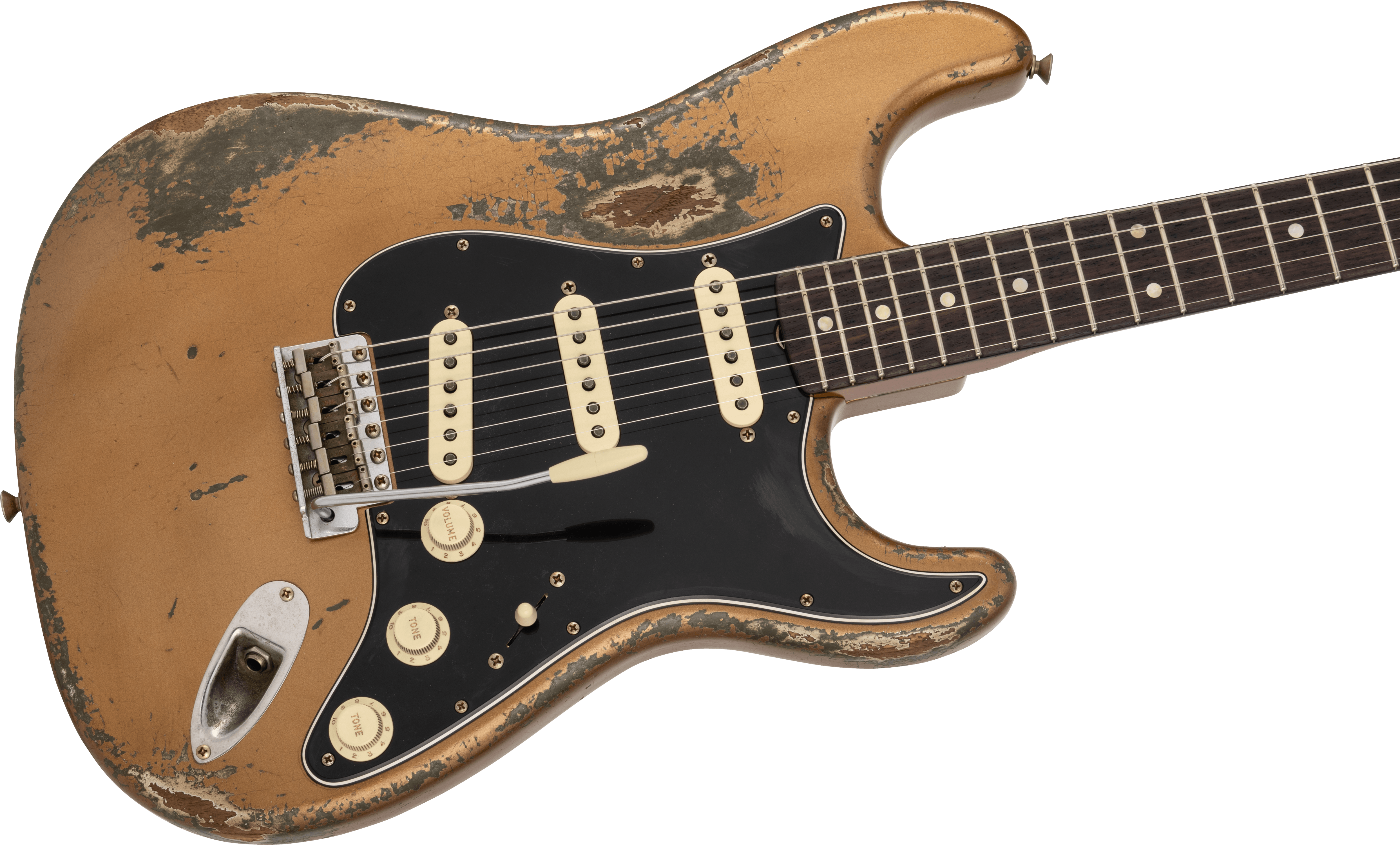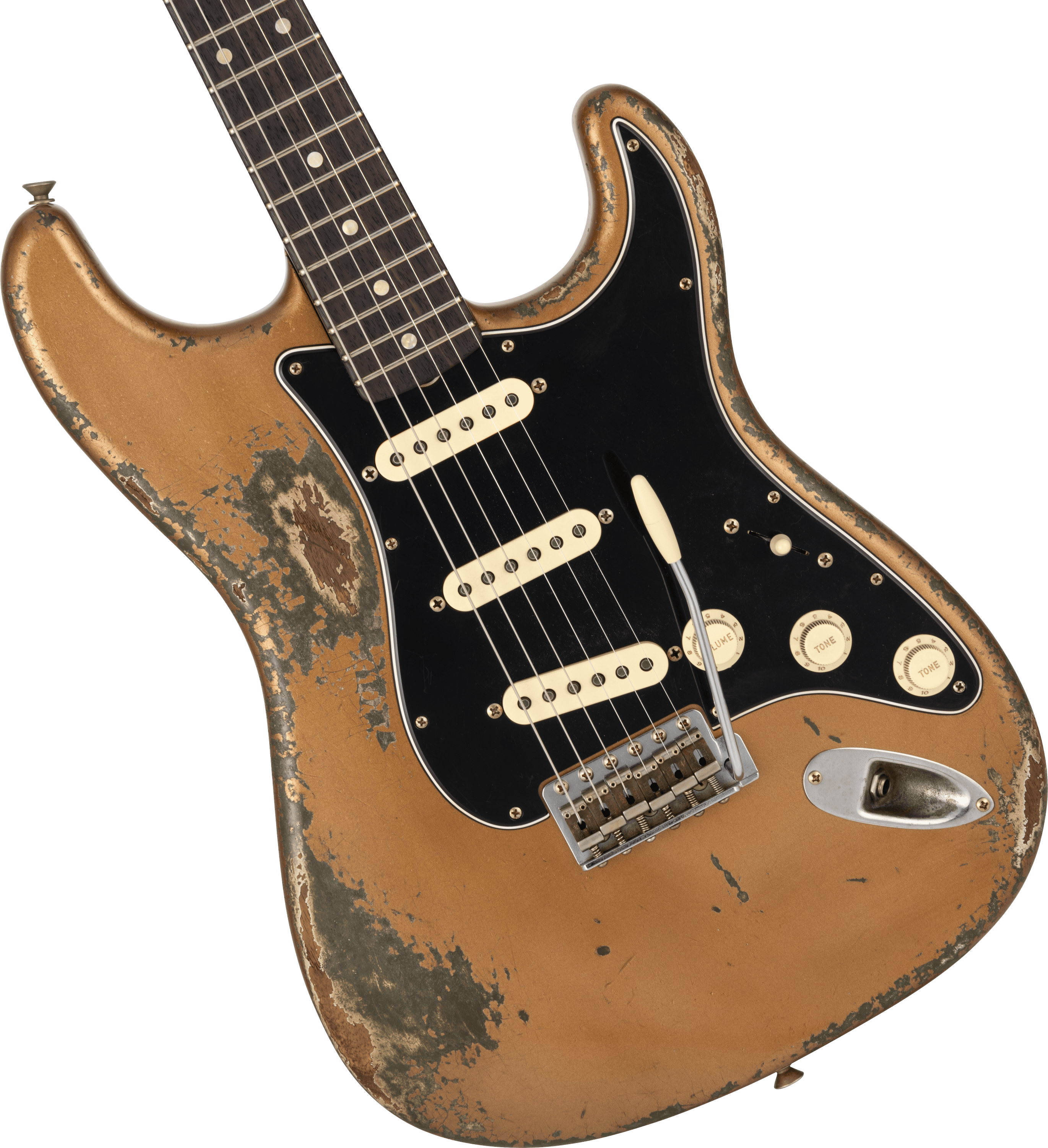 2ピースのセレクト・ローステッドアッシュボディには、美しいレリックラッカー仕上げの Aged Firemist Gold を採用し、演奏によるウェアによって下地の Olive Drab が顔を覗かせる仕様となっています。
